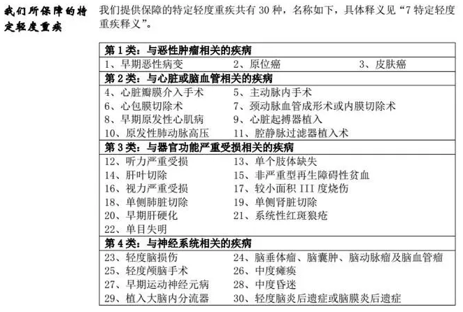 30種輕癥,最多賠付3次,每次賠付嚴(yán)重疾病保額 20%。