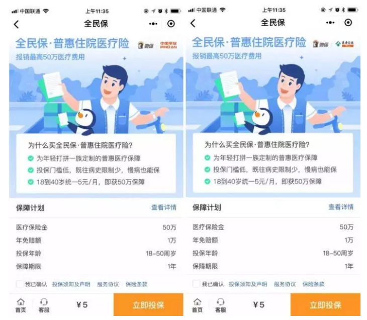 “全民保·醫(yī)療保險”承保方有兩個,一家是平安養(yǎng)老,另一家是泰康在線。不同的用戶在從不同的路徑進(jìn)入時會看到不同的公司,但責(zé)任是相同的。