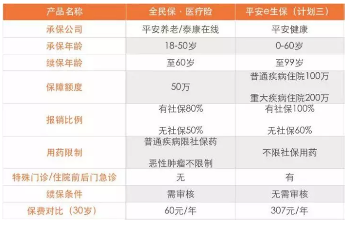 事實(shí)上,仔細(xì)觀察,“全民保”是經(jīng)典百萬醫(yī)療產(chǎn)品的“瘦身版”,多保魚將其與平安e生保進(jìn)行比較。