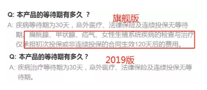 在常見問(wèn)答中,升級(jí)后的2019版不再對(duì)扁桃體、甲狀腺、疝氣、女性生殖系統(tǒng)疾病的檢查與治療設(shè)定理賠時(shí)間限制。