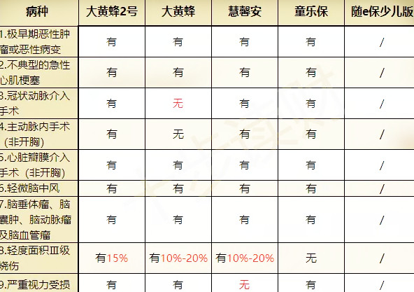 結(jié)論:大黃蜂2包含所有9種高風(fēng)險的輕癥,但與輕度區(qū)III級燒傷的其他產(chǎn)品不同。電子保護版沒有輕癥保障,其他三種產(chǎn)品差別不大。