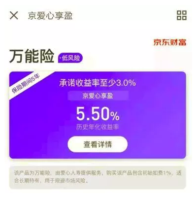 京東金融上面的京愛心享盈萬能險,持有五年保本和保證收入3%,歷史年化收益率為5.5%。在保本的基礎(chǔ)上,它也高于不保本投連險。
