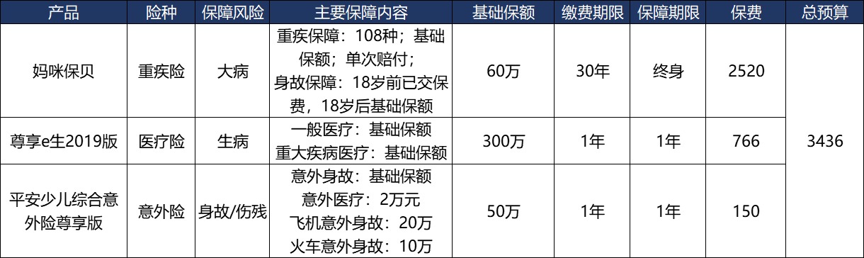 舉例說(shuō)明:預(yù)算相對(duì)充足的情況下,意外險(xiǎn)和醫(yī)療險(xiǎn)依舊不能少,在保障保額的情況下,可以給孩子增加重疾險(xiǎn)的保障期限,在購(gòu)買(mǎi)重疾險(xiǎn)費(fèi)用最低的年齡,就保障到終身,這樣等孩子長(zhǎng)大了,再要加保,也比別人多一份保障。