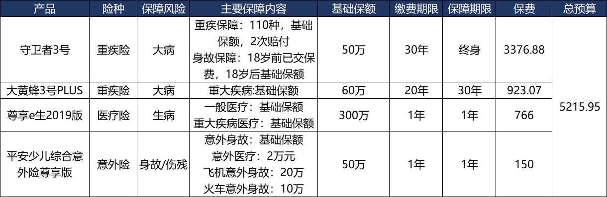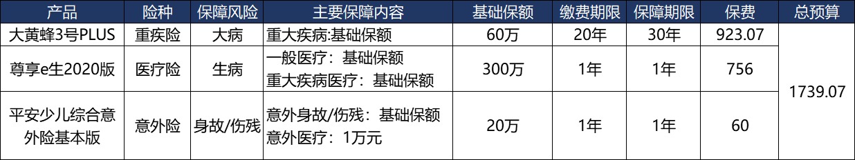 舉例說(shuō)明:定期的重疾險(xiǎn)保費(fèi)923元可以保障60萬(wàn)的保額,同時(shí)搭配一份百萬(wàn)醫(yī)療險(xiǎn),保費(fèi)756元可以保障300萬(wàn)的報(bào)銷額度,保障家庭有足夠的錢(qián)用于給孩子治病看病、康復(fù),維持孩子治愈后的生活水平。意外險(xiǎn)同樣是不可少的,60元的保費(fèi)可以保障20萬(wàn)的保額,彌補(bǔ)意外帶來(lái)的傷害??傮w保費(fèi)在1739.07元。