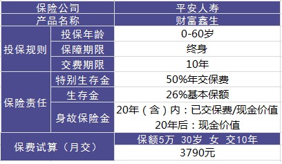 財(cái)富鑫生的交費(fèi)期限為10年,假設(shè)30歲的李女士投保該產(chǎn)品,基本保額5萬,月交保費(fèi)3790元。則: