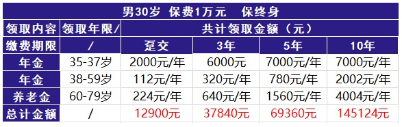 假設(shè)30歲的李先生投保該產(chǎn)品,每年交1萬元,保終身,保額3900元,79歲不幸發(fā)生身故的話,我們來看一下不同的交費(fèi)期限,可以拿到多少錢。