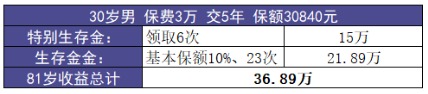 按上面表格條件進行試算30歲男 保費3萬 繳費5年 那么他能領(lǐng)到的特別生存金=年繳保費3萬的10%*繳費年期數(shù)5年=1.5萬。一共能領(lǐng)5次也就是說一共能領(lǐng)5*1.5萬=7.5萬元生存金。