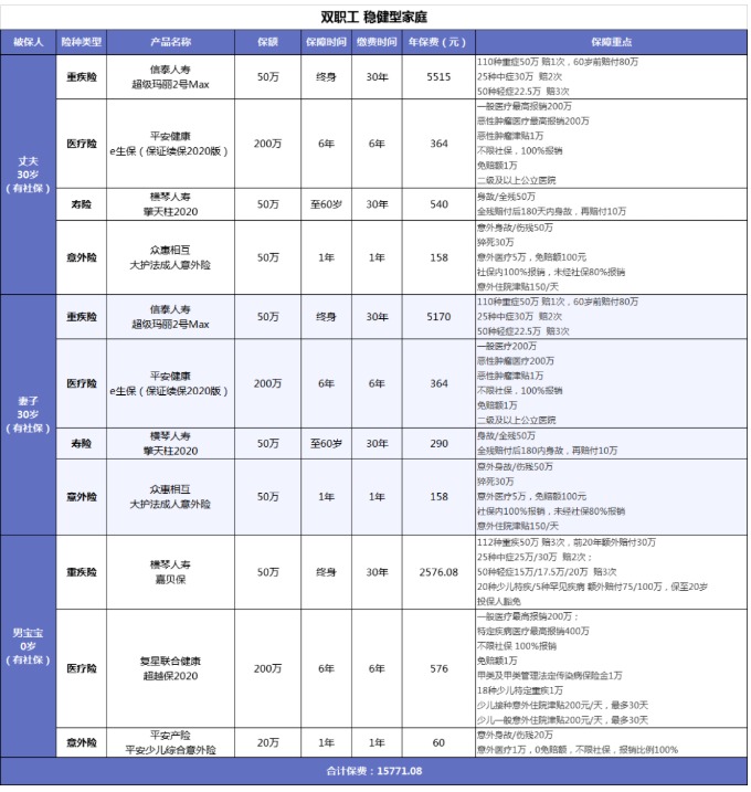 跟前面的案例一樣,夫妻倆都賺錢,所以都需要配上重疾險+醫(yī)療險+壽險+意外險,但保額和保障期限的選擇上,會有所調(diào)整。
