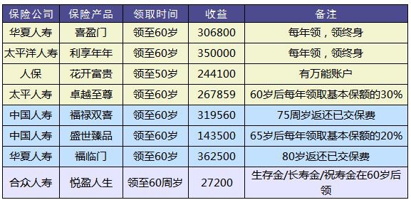 不同的產(chǎn)品,領的“金”不一樣,自然收益也就不一樣,但是這并不妨礙我們算它的收益,除去分紅和萬能賬戶,我們來看看表格中幾款產(chǎn)品的收益,他們是不是符合我們心目中能夠領到的錢呢?