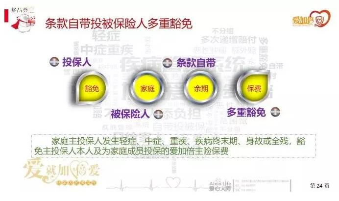 愛加倍是被保險人輕癥豁免、 中癥豁免、重疾豁免、死亡或完全殘疾豁免、疾病結(jié)束期豁免;這應(yīng)該是市面上首款自帶投保人豁免費(fèi)用的重疾產(chǎn)品;在夫妻互保中,例如,40歲,購買50萬其他產(chǎn)品,被保險人的費(fèi)用為豁免約1000元,而在愛加倍中,這筆費(fèi)用免除,真真的是客戶的大福利呢,愛加倍果真加倍愛!