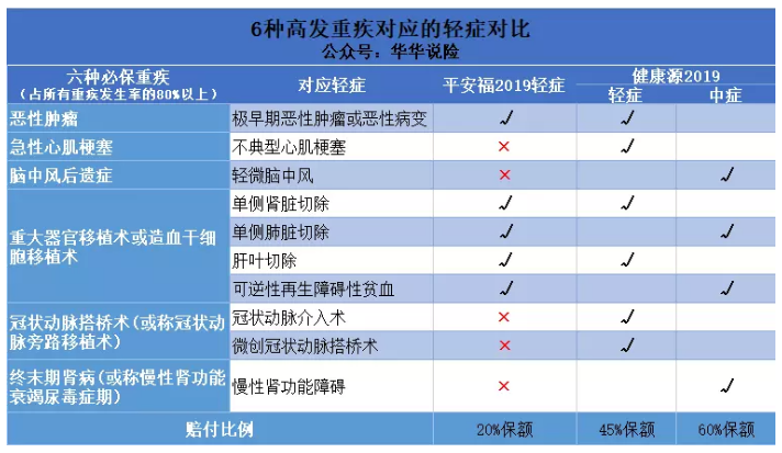 可以看出,覆蓋了與輕癥對應的6種高發(fā)重疾,可以看出健康源2019的輕癥/中癥的保障更全面。