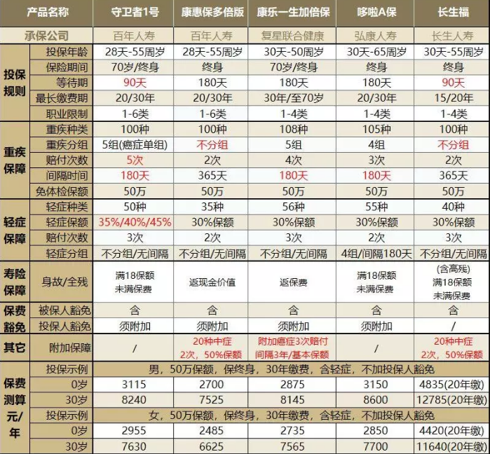 4.從保費(fèi)的價(jià)格上看,50萬保額繳費(fèi)30年,百年的康惠保(多倍版)具有最低價(jià)格,其次是守衛(wèi)者1號、康樂一生加倍保性價(jià)比也很高。