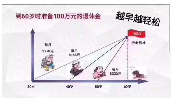 如上圖所示,養(yǎng)老金準(zhǔn)備越早越好。越早準(zhǔn)備,你需要的本金總額就越少。這是時間復(fù)利的結(jié)果。