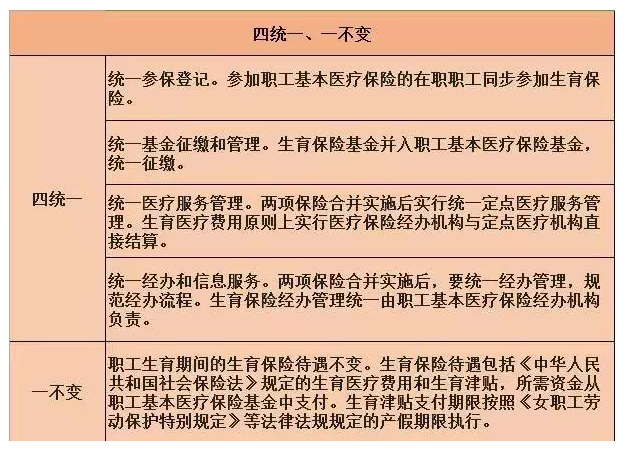關于上述導頻程序的導頻內容中,其概括為“四個統(tǒng)一的、和一個未改變的”。即統(tǒng)一保險登記、統(tǒng)一資金收集和管理、統(tǒng)一醫(yī)療服務管理、統(tǒng)一管理和信息服務,生育期間的生育保險待遇保持不變。具體如下: