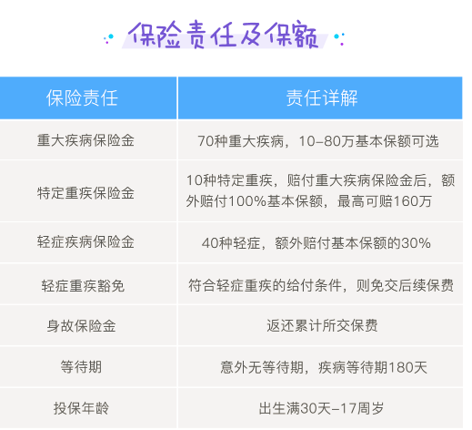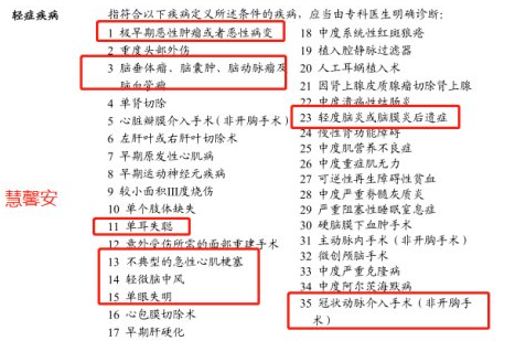 其中70種重大疾病賠付100%的保險(xiǎn)金額,合同在支付后終止,還有另外10種其他特定疾病是賠付保險(xiǎn)金額的兩倍,類似于慧馨安產(chǎn)品責(zé)任,但慧馨安是8種特點(diǎn)疾病,如圖所示: