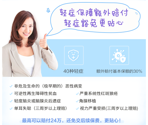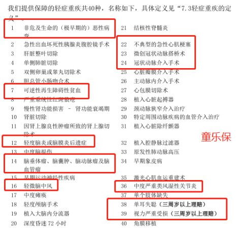中荷生命童樂保兒童的重大疾病,其中輕疾額外30%的保險(xiǎn)金額,輕度疾病后保險(xiǎn)費(fèi)用豁免,剩余重病保障責(zé)任繼續(xù)有效,輕癥疾病類型40種,也非常完整,比慧馨安的35輕疾多一點(diǎn),但基本的輕疾是完整的,這種差異
