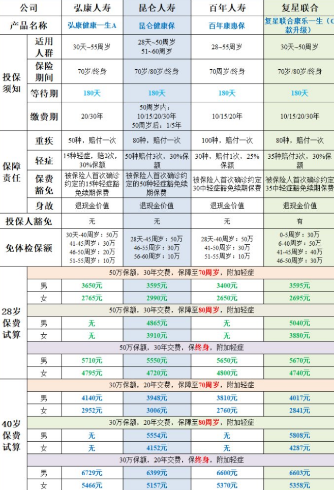 2、從保障責任的角度來看,嚴重的情況只能支付一次,弘康、昆侖、復星聯(lián)合的輕癥可以多次支付,如果你更看中賠付次數(shù),你可以選擇這些;另外弘康、昆侖、百年的輕癥可以選擇是否附加,復星聯(lián)合默認自帶輕癥,如果你只注意嚴重的情況你可以選擇弘康、昆侖、百年的產(chǎn)品;在合同有效期內(nèi),退保(不建議)或死亡可以退還現(xiàn)金價值(罕見);四個產(chǎn)品輕癥可以是豁免后面的保險費用。