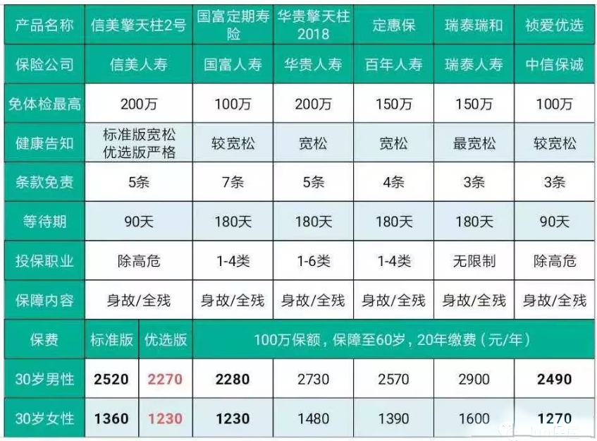 1)在六個(gè)定期壽險(xiǎn)中,信美擎天柱2號(hào)優(yōu)選版本是最便宜的,它比中信保誠禎愛優(yōu)選(非吸煙)費(fèi)率還要便宜;