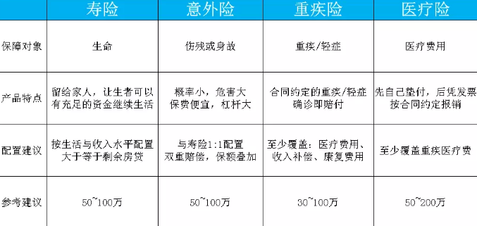 以前我們講過,男性(大部分)作為家庭的經(jīng)濟(jì)支柱,是一個家庭中最需要配備保險(xiǎn)的人,畢竟你的健康才是對其他家人最好的保險(xiǎn)。如果是中產(chǎn)男性又怎么買保險(xiǎn)比較好呢?保魚君的建議是,一定要把保險(xiǎn)買全,我們先用圖片來概括一下人生中需要配置的四種保險(xiǎn)的基本情況。