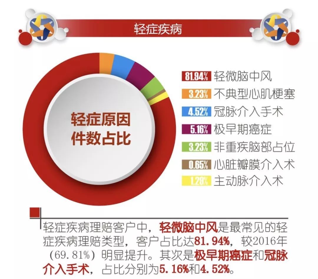 通過數(shù)據(jù)可以看出:輕微腦中風(fēng),極早期惡性腫瘤,冠狀動脈介入手術(shù)排在理賠前三位。