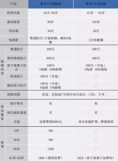 尊享e生爸媽版的保障內(nèi)容類似于尊享e生旗艦版e,并且由重大事故或疾病引起的住院費(fèi)用的報(bào)銷不限制醫(yī)療保險(xiǎn)的內(nèi)外。
