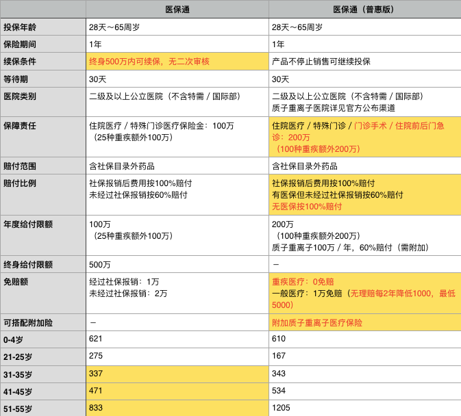 那么醫(yī)保通普惠版和醫(yī)保通有什么區(qū)別?更好嗎?還是不如上一版那樣,我編寫了一張表。有優(yōu)勢的項目標有黃色。項目內(nèi)的優(yōu)化責任標記為紅色,并且截取了幾個年齡組的費率,這更直觀。