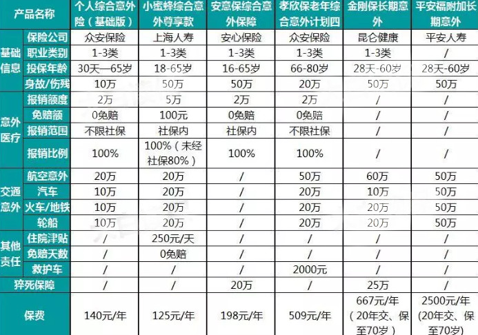 從上表可以看出,普通1年的意外險(xiǎn)非常便宜,比如蜜蜂,50萬保額,只要125元/年,連老人如孝欣保,只需509元/年。